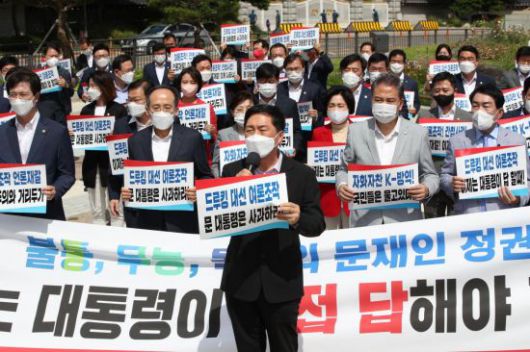 국민의힘 의원 일동은 17일 오후 청와대 분수대 앞 광장에서 '불통, 무능, 독선의 문재인 정권', '자화자찬 K-방역! 국민들은 울고 있다!', '여론조작 언론재갈 민주주의와 거리두기!' 등의 피켓을 들고 문 정부를 비판하는 구호를 외쳤다.