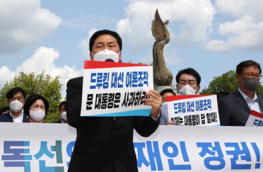 국민의힘은 8월 임시국회가 시작된 17일 청와대 앞에서 드루킹 댓글 조작 사건, ‘충북간첩단’ 사건 등에 대한 대통령의 입장 표명을 촉구하는 긴급 의원총회를 열었다.