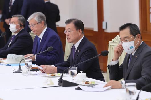 문 대통령은 "중앙아시아 최초의 민관 합작 투자 프로젝트인 ‘알마티 순환도로 건설사업’에 한국 기업이 참여하고 있다"며 "두 나라 기업이 합작 설립한 알마티 자동차 공장은 올해부터 본격적인 생산에 돌입했고, 한국의 PCR진단 기업이 카자흐스탄에 진출해 코로나 대응에 힘을 보태고 있다"고 했다.