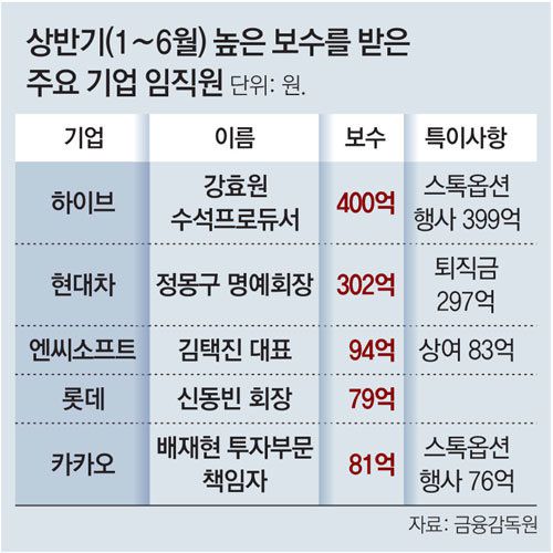 올해 상반기(1∼6월) 상장사 임직원 중 가장 많은 보수를 받은 사람은 BTS 소속사인 하이브 강효원 수석프로듀서(38)였다. 주식매수선택권(스톡옵션) 행사 이익 399억 원을 더해 400억 원을 받았다. 일회성 보수를 제외한 급여 및 상여로는 김택진 엔씨소프트 대표(94억 원)가 가장 많았다.