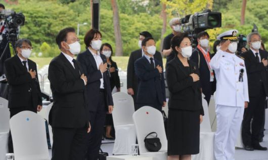 [대전=뉴시스] 전진환 기자 = 문재인 대통령과 김정숙 여사가 18일 오전 국립대전현충원에서 열린 홍범도 장군 유해 안장식에 참석해 국민의례를 하고 있다. 2021.08.18. amin2@newsis.com |