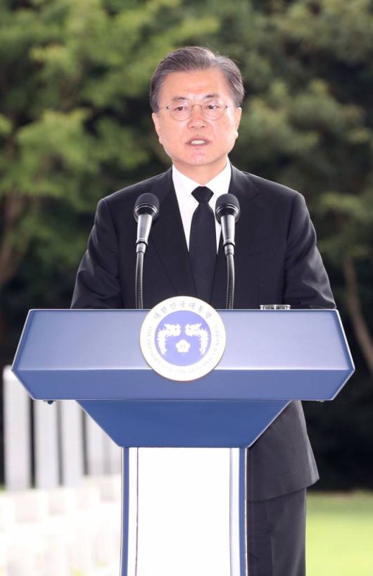 [대전=뉴시스 전진환 기자 = 문재인 대통령이 18일 오전 국립대전현충원에서 열린 홍범도 장군 유해 안장식에 참석해 추념사를 하고 있다. 2021.08.18. amin2@newsis.com |