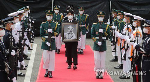 참석자들은 21발의 예포가 발사되는 가운데 묵념으로 고인의 넋을 기렸다.