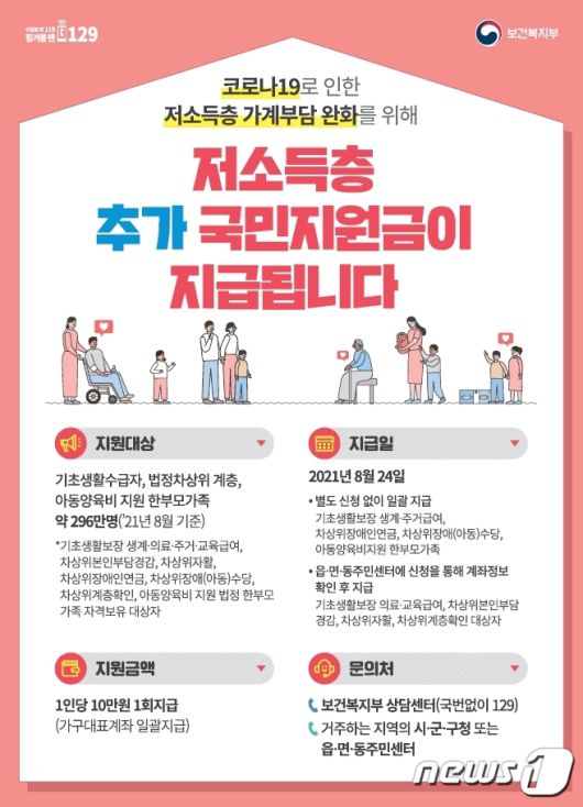 지원금은 이달 24일 일괄 지급될 예정이다. 단, 계좌오류가 생기거나 이달 신규로 책정되는 법정 저소득층 등은 다음 달 15일까지 추가로 지급할 계획이다.