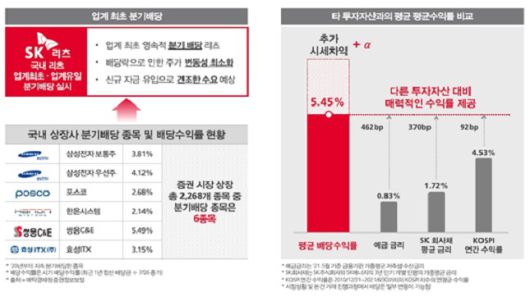 전체 2455개 상장사 중 분기 배당을 실시하는 기업은 삼성전자를 비롯해 포스코, 한온시스템, 쌍용C&E, 효성ITX 등 6개 종목에 불과하다. 이들 기업의 평균 배당수익률은 3.57%로 SK리츠가 제시한 배당수익률보다 약 2%포인트 가까이 낮다.