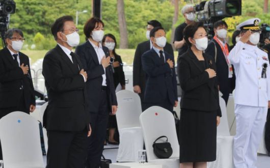 [대전=뉴시스] 전진환 기자 = 문재인 대통령과 김정숙 여사가 18일 오전 국립대전현충원에서 열린 홍범도 장군 유해 안장식에 참석해 국민의례를 하고 있다. 2021.08.18. amin2@newsis.com |