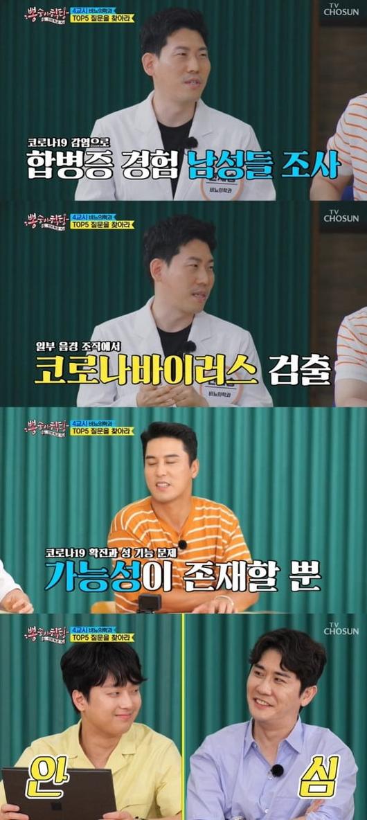 멤버들의 반응에 전문의는 "가능성이 존재할 뿐이다. 코로나19가 최신 질환이기 때문에 아직 연구 중"이라고 빠르게 덧붙였다. 그는 "연구 중 하나가 코로나 감염증으로 합병증이 많은 분들 중에서 일부 조직 검사를 해본 결과 음경 조직에서 코로나 바이러스가 검출됐다"면서 "발기와 관련된 수많은 과정에서 악역향을 끼칠 수 있다는 가능성이 제시됐을 뿐"이라고 설명했다. 자세한 설명에 멤버들은 안심한 표정을 지었다.
