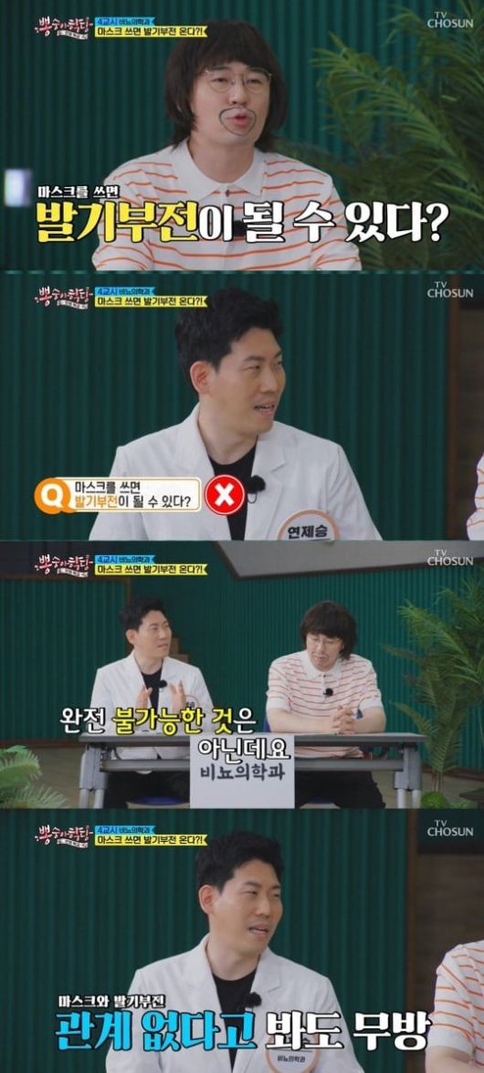 붐은 "마스크를 쓰면 발기부전이 될 수 있냐"고 질문했고, 전문의는 "통상적인 의미에서는 '아니다'고 할 수 있다"라면서도 "완전히 불가능한 건 아니다"라고 빠르게 덧붙였다.