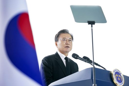 문재인 대통령이 18일 오전 국립대전현충원에서 열린 홍범도 장군 유해 안장식에서 추념사를 하고 있다. 연합뉴스 |
