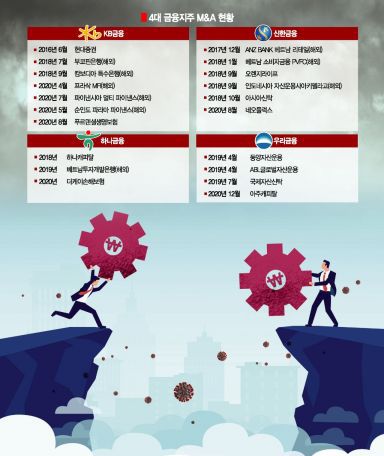 19일 KB·신한·하나·우리 등 4대 금융지주에 따르면 국내외 M&A는 기존 진행분의 마무리 작업을 제외하면 지난해 하반기 이후 현재까지 M&A 대어(大漁)를 낚는데 진척이 없는 상태다.