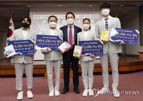 (서울=연합뉴스) 조희연 서울시교육감이 19일 오후 서울 종로구 서울시교육청에서 황선우(수영, 서울체고3), 이윤서(기계체조, 서울체고3), 서채현(스포츠클라이밍, 서울신정고3), 이은지(수영, 오륜중3) 등 도쿄올림픽 국가대표 학생선수들을 초청, 일반학생들과의 랜선 만남을 마친 뒤 기념촬영을 하고. 2021.8.19 [서울시교육청 제공. 재판매 및 DB 금지]