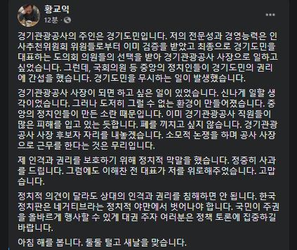 황 씨는 이날 페이스북 글에서 "경기관광공사 사장 후보자 자리를 내놓겠다"면서 "소모적 논쟁을 하며 공사 사장으로 근무를 한다는 것은 무리"라면서 이같이 밝혔다.