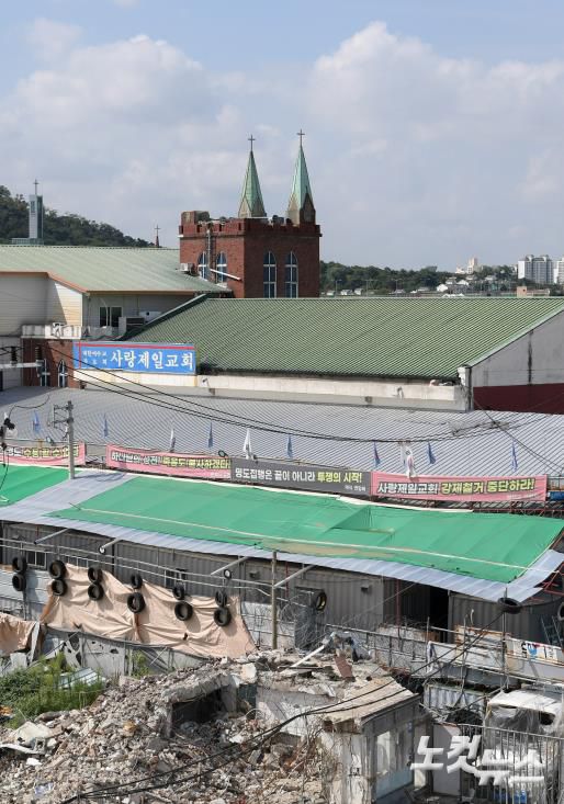 대면 예배가 금지된 상황에서도 교인들이 모여 예배를 강행한 서울시 성북구 사랑 제일교회에 대한 시설 폐쇄 조치가 내려졌다. 수도권에 사회적 거리두기 4단계가 내려진 상황에서 대면 예배가 금지됐지만 지난달 18일부터 5주 연속 일요일마다 대면 예배를 강행했다. 사진은 20일 오전 서울 성북구 사랑 제일교회의 모습.저작권자 © CBS 노컷뉴스 무단전재 및 재배포 금지