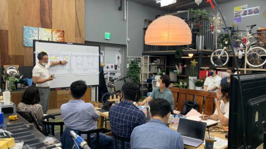 에코브는 자전거 샷시와 부품을 만들고 있다. 그것도 화물용 자전거란다. 화물용 자전거 샷시를 만드는 회사에 비즈니스모델하는 필자가 무슨 말을 해줄 수 있을까 걱정부터 앞섰다. 필자 머릿속은 이미 70년대 철공소로 시간 여행 중이었고 ‘아, 잘못 걸렸구나’ 싶은 마음에 소 끌려가듯 에코브로 향했다.에코브 사무실에서 BM을 분석하고 있는 황현철 대표, 출처: IT동아 |