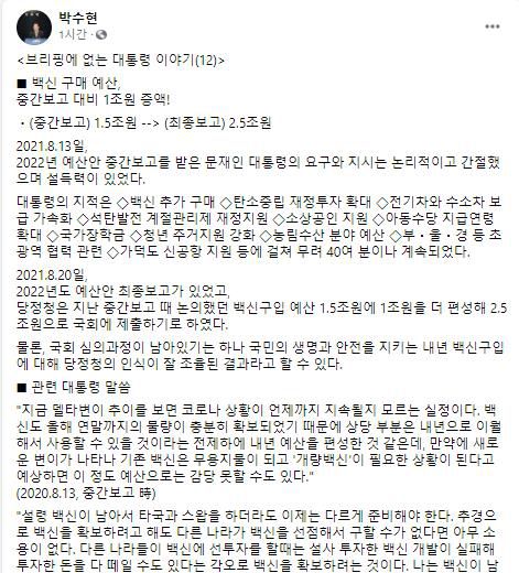 박 수석은 이날 '브리핑에 없는 대통령 이야기'라는 제목의 SNS 글을 통해 당정청이 1조5천억원으로 편성했던 백신구입 예산을 2조5천억원으로 증액하기로 한 것과 관련, 지난 13일 예산안 중간보고 당시 문 대통령의 지시를 요약해 전했다.