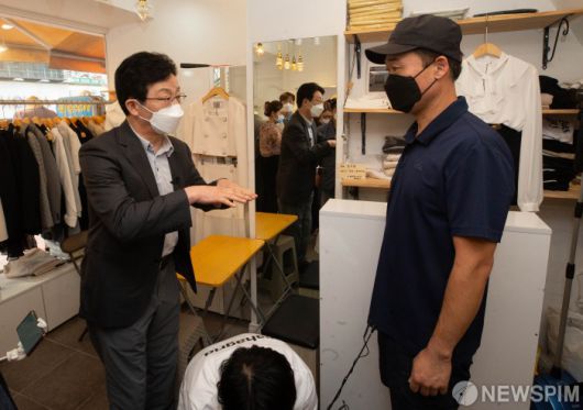 [서울=뉴스핌] 윤창빈 기자 = 유승민 국민의힘 대선 예비후보가 22일 오전 서울 마포구 홍대거리에 있는 한 옷가게에서 자영업자와 대화를 나누고 있다. 2021.08.22 pangbin@newspim.com