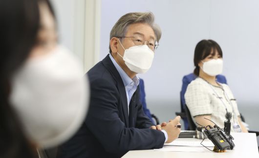 더불어민주당 대권주자인 이재명 경기지사가 22일 서울 용산구 전자랜드에 위치한 숙명여대 캠퍼스타운사업단에서 열린 여성청년 스타트업 간담회에서 사업단에 대한 설명을 듣고 있다. [연합] |