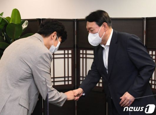 국민의힘 대권주자인 윤석열 전 검찰총장(오른쪽)이 22일 서울 종로구 국민캠프에서 열린 자영업 비대위 간담회에서 이창호 자영업비대위 공동대표와 악수하고 있다. 2021.8.22/뉴스1 |