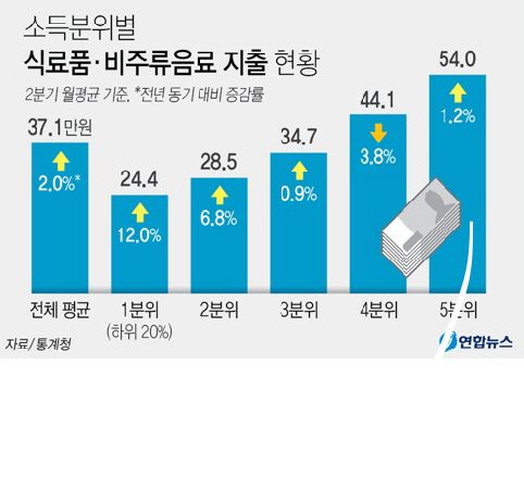 소득 하위 20~40%인 2분위 가구는 식료품·비주류음료에 28만5000원(+6.8%)을 썼다. 3분위는 34만7000원(+0.9%), 4분위는 44만1000원(-3.8%), 5분위는 54만원(+1.2%) 등이다.