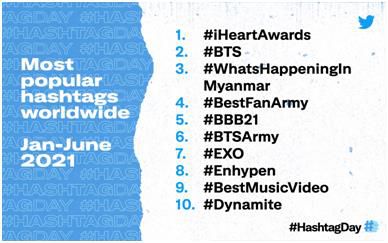상반기 가장 많이 사용된 해시태그는 미국 온라인 라디오 방송사가 주최하는 시상식 '#iHeartAwards'(아이하트라디오 뮤직 어워즈)였고, 3위는 미얀마 군부 쿠데타와 관련된 '#WhatsHappeninginMyanmar'(미얀마에서 벌어지고 있는 일)로 집계됐다.