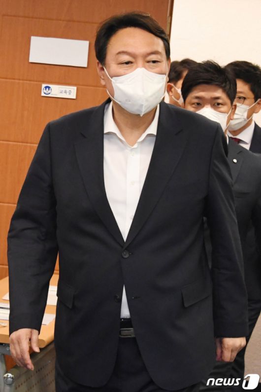 (서울=뉴스1) 오대일 기자 = 국민의힘 대권주자인 윤석열 전 검찰총장이 22일 서울 종로구 국민캠프에서 열린 자영업 비대위 간담회에 입장하고 있다. 2021.8.22/뉴스1 |