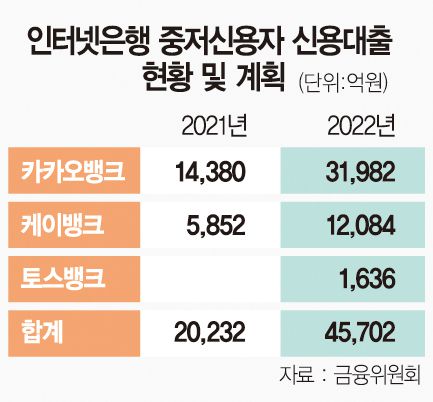 이처럼 신용도가 상대적으로 낮은 고객을 대상으로 포용 금융에 적극적으로 나서는 인터넷은행업계지만 최근 금융권의 대출 옥죄기 움직임은 부담스럽다. 목적이야 어떻든 간에 대출을 줄여가는 금융권 움직임에 반하는 행동으로 비칠 수 있어서다. 한 인터넷은행 관계자는 “‘누구는 해주고 누구는 안 해주는 것은 차별 아니냐’는 지적도 있다”며 “최근 일부 은행의 대출 중단 사태와는 결이 다르지만 (중·저신용자 대상으로) 적극적으로 대출을 장려하는 게 부담스러운 것은 사실”이라고 말했다.
