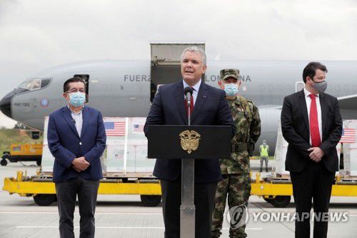 미 지원 코로나 백신 앞에서 연설하는 콜롬비아 대통령 |