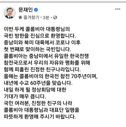 문 대통령은 이날 페이스북에 글을 올려 "중남미와 북미 대륙에서 코로나 이후 첫 번째로 맞이하는 국빈"이라며 "진심으로 환영한다"고 밝혔다.
