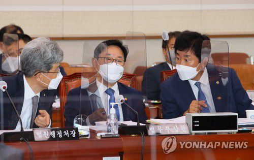 대화나누는 법원행정처장 법무장관 헌재 사무처장 |