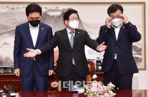 박병석(가운데) 국회의장과 윤호중(오른쪽) 더불어민주당 원내대표, 김기현 국민의힘 원내대표가 25일 오전 서울 여의도 국회 의장실에서 회동하고 있다. 한편, 논란을 빚은 언론중재법 개정안의 처리는 다음 본회의로 미뤄졌다.(사진=노진환 기자) |