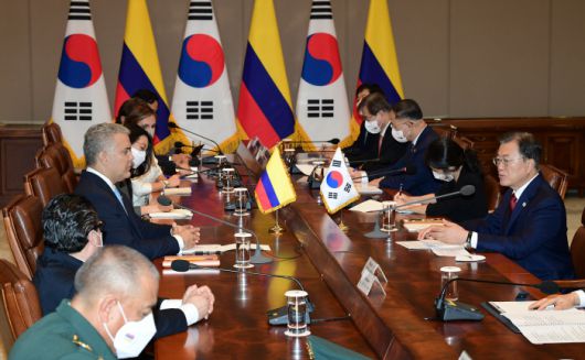 문 대통령은 콜롬비아 6·25전쟁 참전용사와 가족에 대한 보훈 협력 확대 의사도 이날 밝혔다. 콜롬비아는 중남미 유일의 6·25전쟁 참전국이다. 두케 대통령의 이번 방한에는 콜롬비아 참전용사 2명도 동행했다.