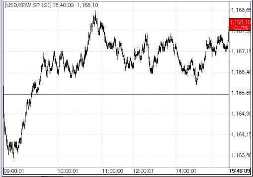 25일 서울외국환중개에 따르면 이날 환율은 전 거래일 종가(1165.60원)보다 2.50원 오른 1168.10원에 마감했다. 이날 환율은 전 거래일 종가보다 0.6원 내린 1165.00원에 출발해 1160원대 초중반에서 등락하다가 오전 중 상승 전환했다.