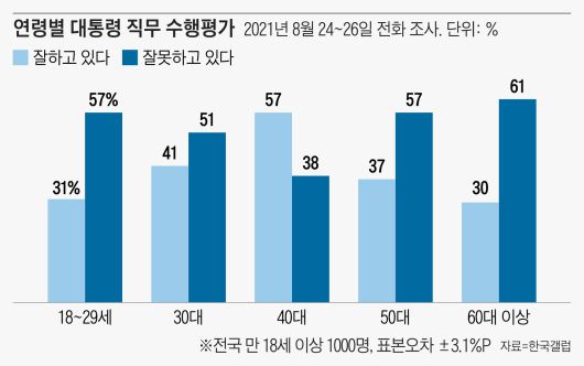연령별로 보면 20대(긍정 31%·부정 57%), 30대 (긍정 41%·부정 51%), 40대(긍정 57%·부정 38%), 50대(긍정 37%·부정 57%), 60대 이상 (긍정 30%·부정 61%)로 집계됐다. 특히 50대에선 지난주 긍정평가가 50%였지만 일주일 만에 37%로 13%포인트가 하락했다.