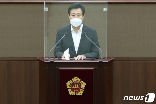 (서울=뉴스1) 조태형 기자 = 오세훈 서울시장이 27일 오후 서울 중구 서울시의회에서 열린 제302회 임시회에 참석해 2차 추가경정예산 시정연설을 하고 있다. 2021.8.27/뉴스1phototom@news1.kr[© 뉴스1코리아(news1.kr), 무단 전재 및 재배포 금지]