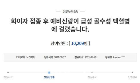 오는 11월 결혼을 앞둔 예비 신부라고 자신을 소개한 청원인은 지난 27일 “예비 신랑은 대구에서 체육교사로 근무 중인 30대”라며 “지난달 28일 화이자 1차 접종을 했고, 지난 24일 급성 골수성 백혈병 판정을 받았다”고 썼다.