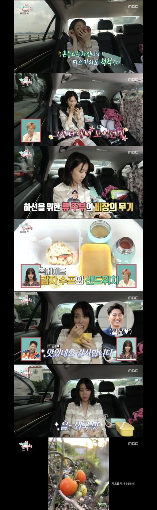 라디오 방송 퇴근길, 박하선은 도시락을 꺼냈다. 하선을 위해 남편 류수영이 감자 수프와 샌드위치, 토마토 주스를 직접 만들어 도시락으로 준비해준 것. 박하선 매니저도 감동 받은 얼굴로 함께 맛있게 감자 수프를 먹었다.
