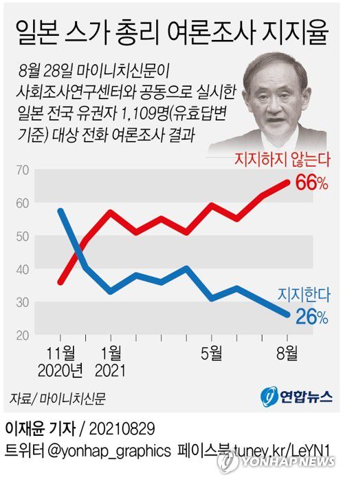 마이니치신문이 28일 사회조사연구센터와 공동으로 전국 유권자 1천109명(유효답변 기준)을 대상으로 전화 여론조사를 한 결과에 따르면, 스가 내각 지지율은 지난달 17일 조사 때와 비교해 4%포인트 낮은 26%를 기록하며 30% 지지선이 처음 무너졌다.