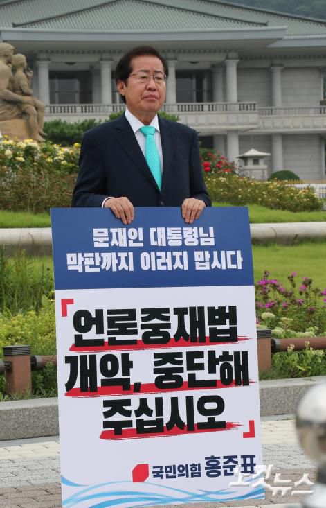 국민의힘 대권주자 홍준표 의원이 29일 청와대 앞에서 더불어민주당의 '언론중재법 개정안' 강행 수순을 규탄하는 1인시위하고 있다.