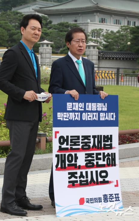 국민의힘 대권주자 홍준표 의원이 29일 청와대 앞에서 더불어민주당의 '언론중재법 개정안' 강행 수순을 규탄하는 1인시위 도중 현장을 찾은 장성민 국민의힘 대선 후보과 대화하고 있다.저작권자 © CBS 노컷뉴스 무단전재 및 재배포 금지