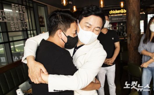 국민의힘 원희룡 대선 예비후보가 29일 서초구 남부순환로의 한 호프집에서 자영업자들과 간담회를 갖고 코로나 장기화로 인한 자영업자들의 고충에 대해 이야기를 나누고 포옹을 하고 있다.저작권자 © CBS 노컷뉴스 무단전재 및 재배포 금지
