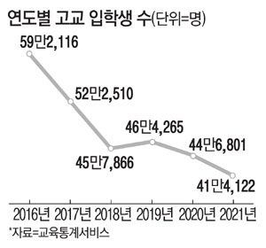 학령인구 감소 추세가 이어지면서 고교 지원자도 줄어드는 게 결정적이다. 고교에 진학하는 학생 수는 최근 5년 새 18만명 가까이 급감했다. 교육통계서비스에 따르면 고교 입학생 수는 2016년 59만2116명에서 이듬해 52만2510명으로 약 7만명이 쪼그라든 데 이어 2018~2019년 45만~46만명대까지 줄었다. 현재는 41만명 선(41만4122명)으로 내려앉았다.
