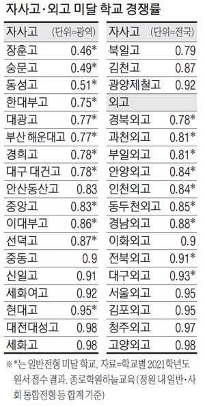 정원 내 기준 신입생 모집 경쟁률 측면에서는 외고가 평균 1.04대1, 광역단위 자사고는 0.95대1, 전국단위 자사고는 1.48대1을 기록했다. 과학고가 평균 3.18대1을 나타낸 것과 대비되는 모습이다.
