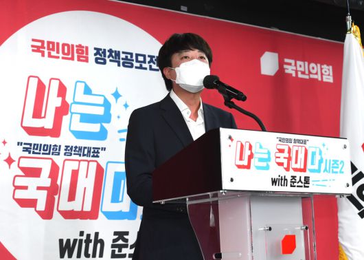 이준석 국민의힘 대표가 27일 오후 서울 영등포구 여의도 중앙당사에서 열린 국민의힘 정책공모전 '나는 국대다 시즌2 with 준스톤' 결선심사에서 인사말을 하고 있다. 연합뉴스