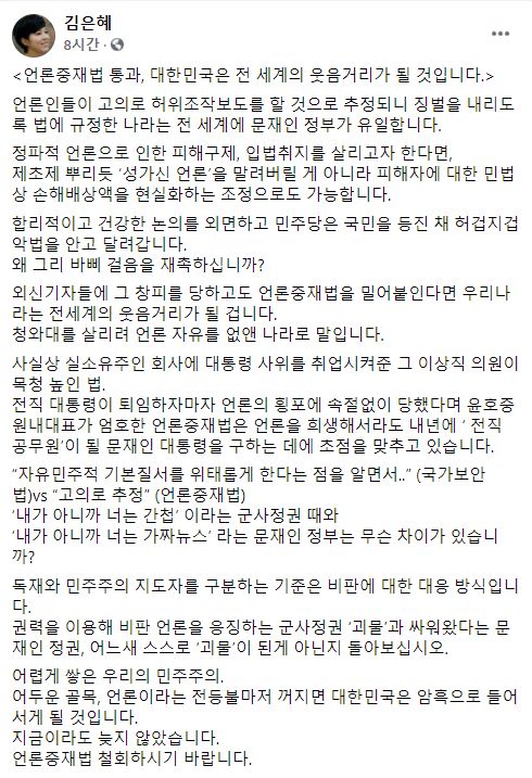 김 의원은 "어렵게 쌓은 우리의 민주주의"라며 "어두운 골목, 언론이라는 전등불마저 꺼지면 대한민국은 암흑으로 들어서게 될 것"이라고 우려했다.
