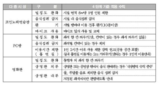 특히 코인노래연습장의 경우 ▲밀집도 완화 ▲음식물 섭취 여부▲환기 및 마이크 관리 현황을 중점적으로 확인하고 PC방의 경우 ▲밀집도 완화 ▲ 음식물 섭취 여부 ▲ 흡연실 운영관리를 집중해서 점검한다. 영화관은 ▲ 밀집도 완화 ▲상영관 외부와 내부의 방역수칙 준수 여부를 확인한다.