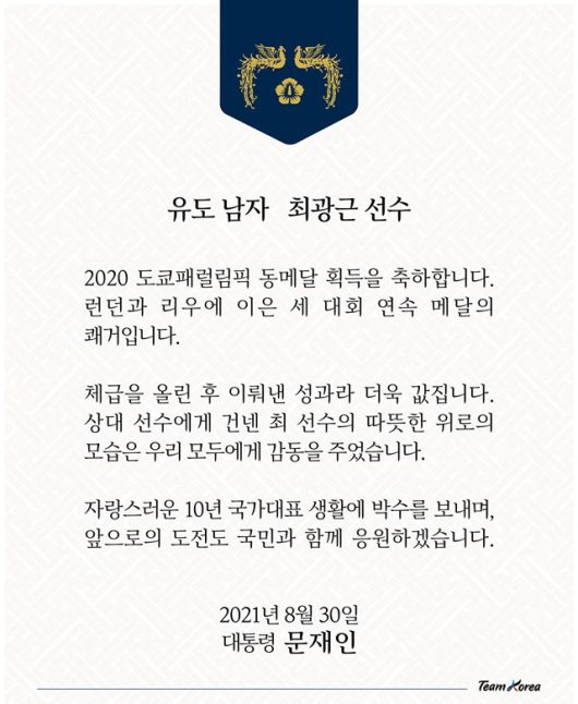 문 대통령은 이날 오전 SNS를 통해 "최광근 선수의 2020 도쿄 패럴림픽 동메달 획득을 축하한다"라며 "런던과 리우에 이은 세 대회 연속 메달의 쾌거"라고 밝혔다.