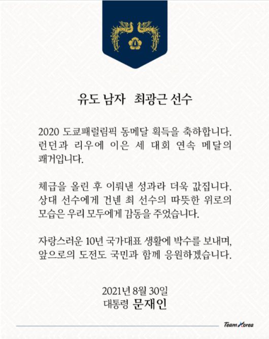 문 대통령은 축전에서 “2020 도쿄패럴림픽 동메달 획득을 축하한다”며 “런던과 리우에 이은 세 대회 연속 메달의 쾌거”라고 말했다.