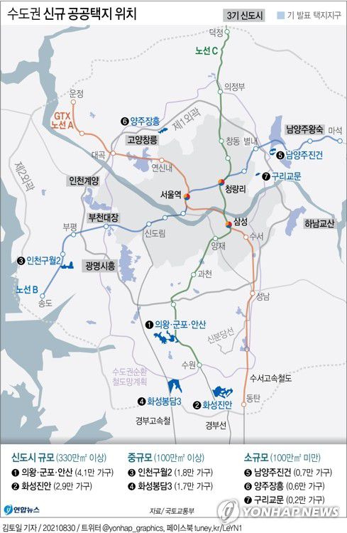 신도시급으로 공급하는 택지 대부분은 수도권 광역급행철도(GTX) 라인에 걸쳐 있어 철도망을 통해 서울 접근성을 높인다는 구상이다.