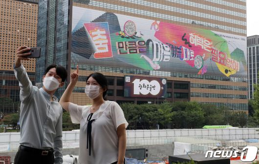 (서울=뉴스1) 박세연 기자 = 30일 오전 서울 종로구 교보빌딩에 100번째 광화문글판 '춤 만큼은 마음 가는 대로, 허락은 필요 없어'을 배경으로 시민들이 사진을 찍고 있다. 글로벌 아티스트 방탄소년단(BTS)가 100번째 광화문글판을 위해 문안 제작에 참여한 이번 글판은 코로나 펜데믹으로 제약이 늘고 고단한 하루 속에서도 허락받지 않고 자유로움을 느낄 수 있는 것을 찾자는 메시지를 담았다. 2021.8.30/뉴스1