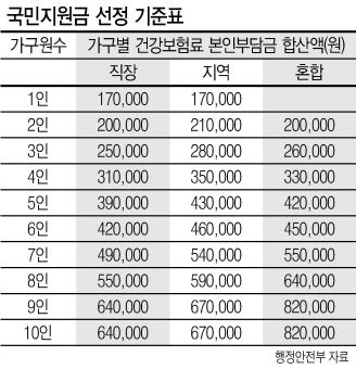 가구별 지원금액의 상한선이 없어서 5인가구는 125만원(직장보험료 39만원·지역 43만원·혼합 42만원 이하), 6인가구는 150만원(직장보험료 42만원·지역 46만원·혼합 45만원 이하)으로 가구원 수에 비례해 지급 가능하다. 단 이런 기준에 부합하더라도 가구 구성원의 지난해 재산세 과세표준 합계액이 9억원을 초과하거나 지난해 종합소득 신고분 금융소득(이자·배당 포함) 합계액이 2000만원을 초과하면 지원금을 받을 수 없다. 고액 자산가 배제를 위한 ‘컷오프’ 기준을 따로 뒀기 때문이다.